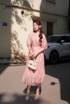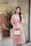 Đầm lụa tơ bọt hồng hai tầng nhún